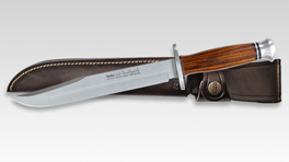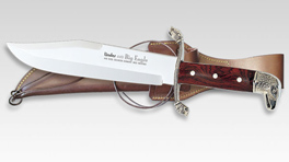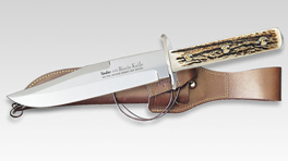 | Arkansas Toothpick handmade by Carl Linder, Solingen. Dieses Bowie Messer verdankt seinen Namen der schlanken Form (Toothpick = Zahnstocher). Der Arkansas Toothpick war eine beliebte Waffe im Süden der Vereinigten Staaten zur Zeit der Baumwollplantagen. Der Griff besteht aus edlem Cocobolo-Holz, die Klinge wurde in 440A Stahl ausgeführt. nur 99,50 EURO | Big Eagle Zuerst fällt bei diesem Messer die interessante Griffgestaltung auf: der Knauf ist in Form eines Adlerkopfes ausgeführt, der Knebel zeigt einen doppelten Hundekopf. Beide Elemente sind aus echtem Neusilber. Die kräftige Klinge aus rostfreiem Hochleistungsstahl 440A. Für die Holzgriffschalen wurde ausgesuchtes Cocoboloholz genommen. nur 226,50 EURO | Linder Bowie Messer 19,5cm lange Klinge aus 440 Stahl, rostfrei satiniert. Mit Griffschalen aus echtem Hirschhor n.Hochwertige Lederscheide. Gesamtlänge: 32,6cm Klingenlänge: 19,5 cm Gewicht: 402 g nur 144,50 EURO | ||